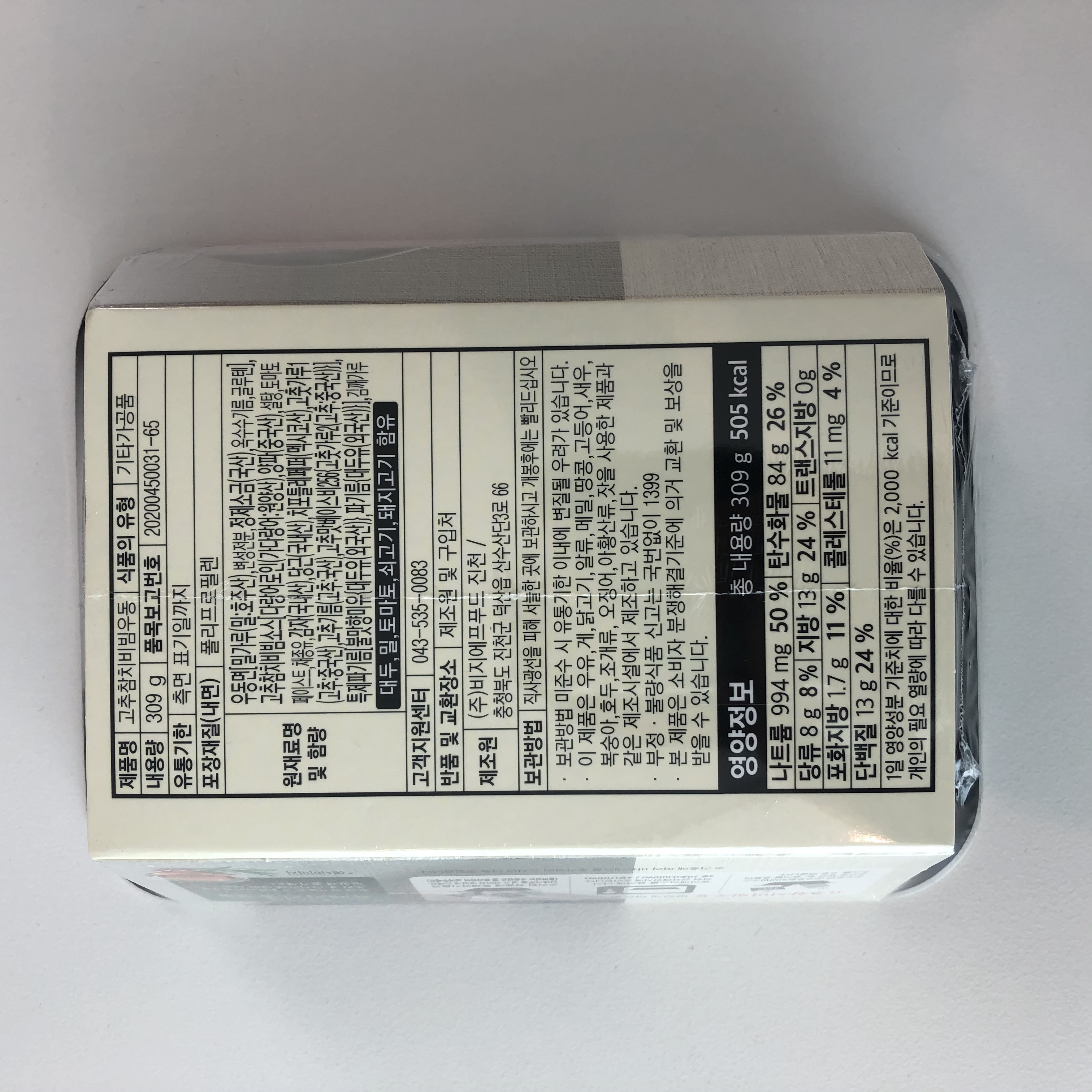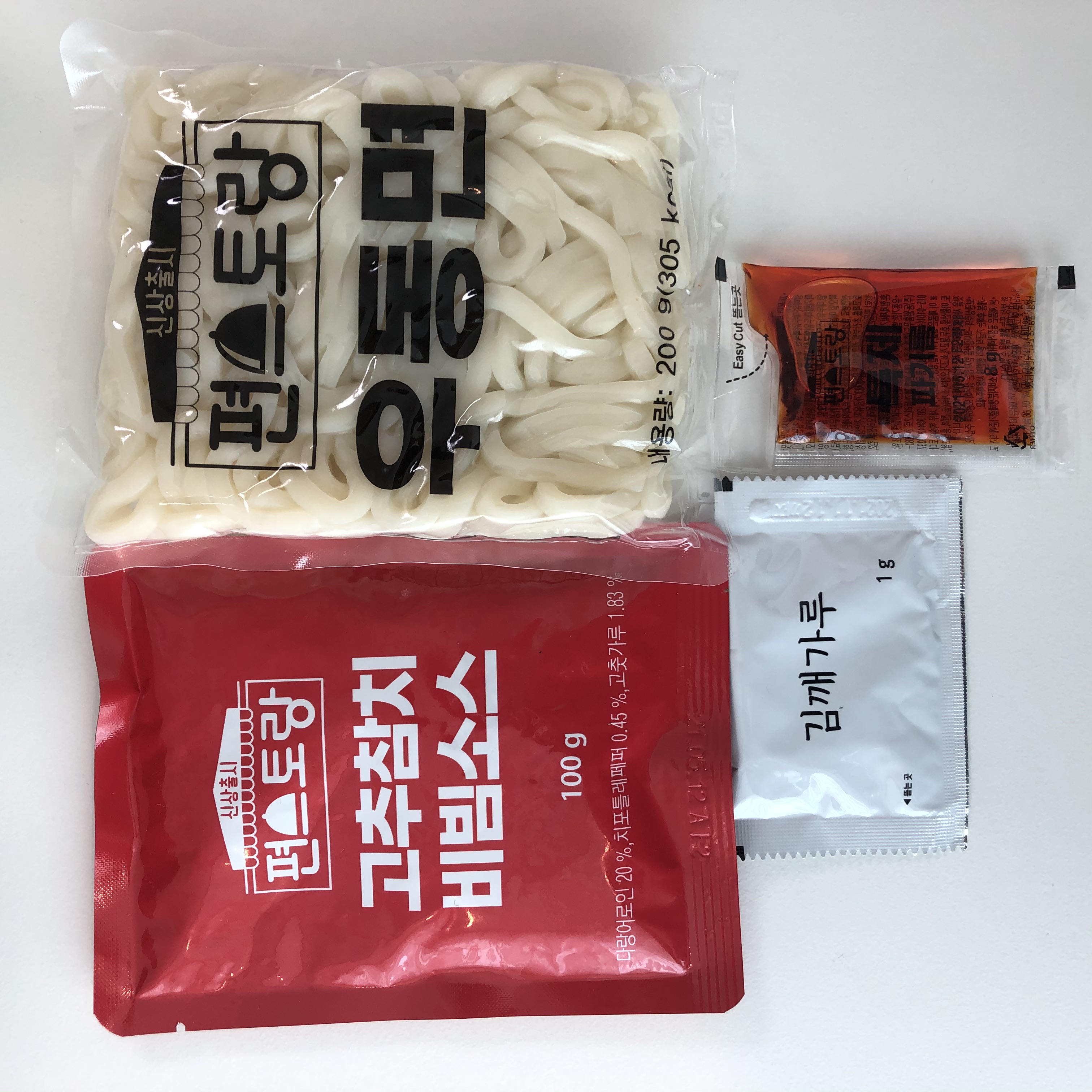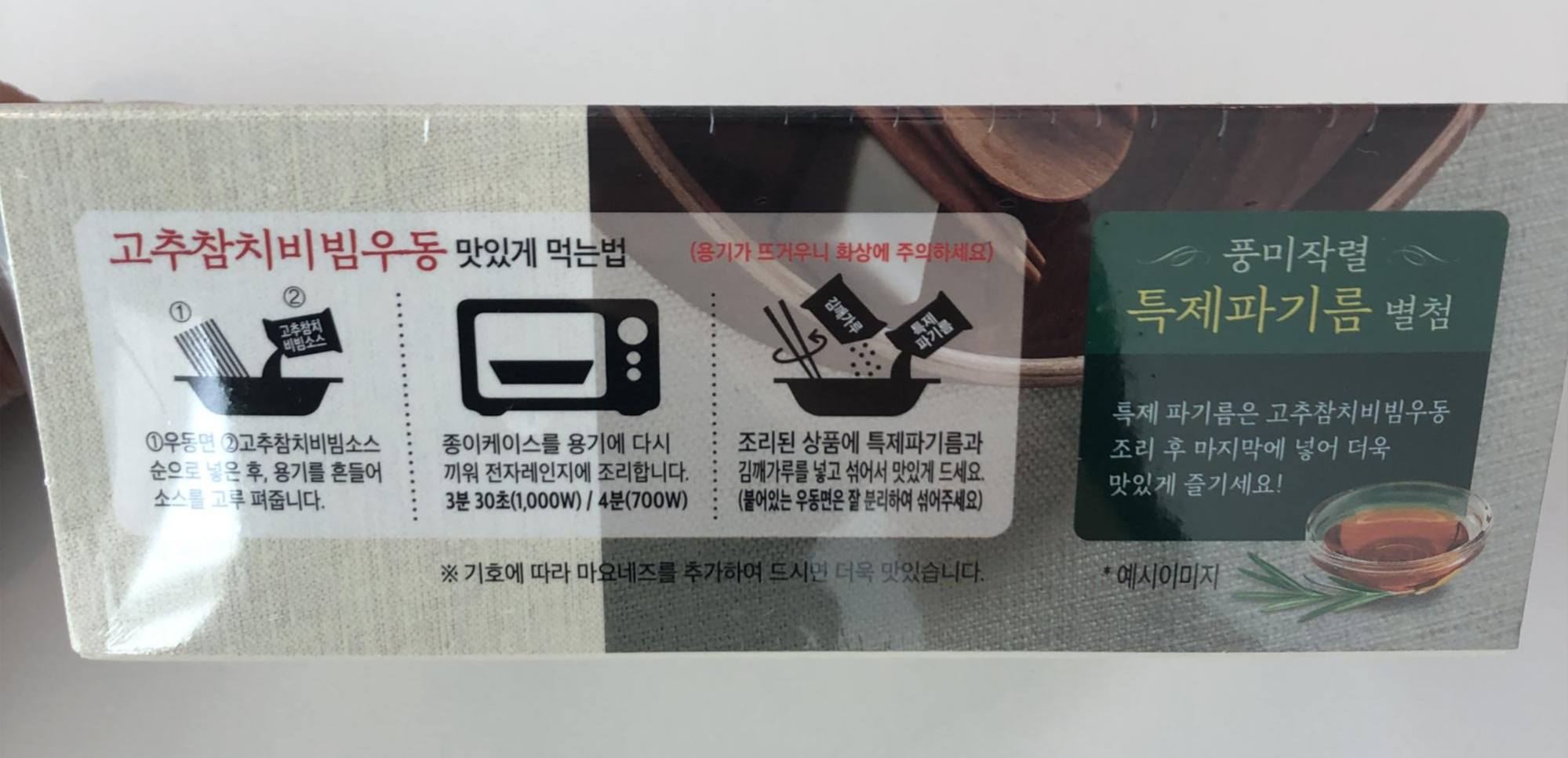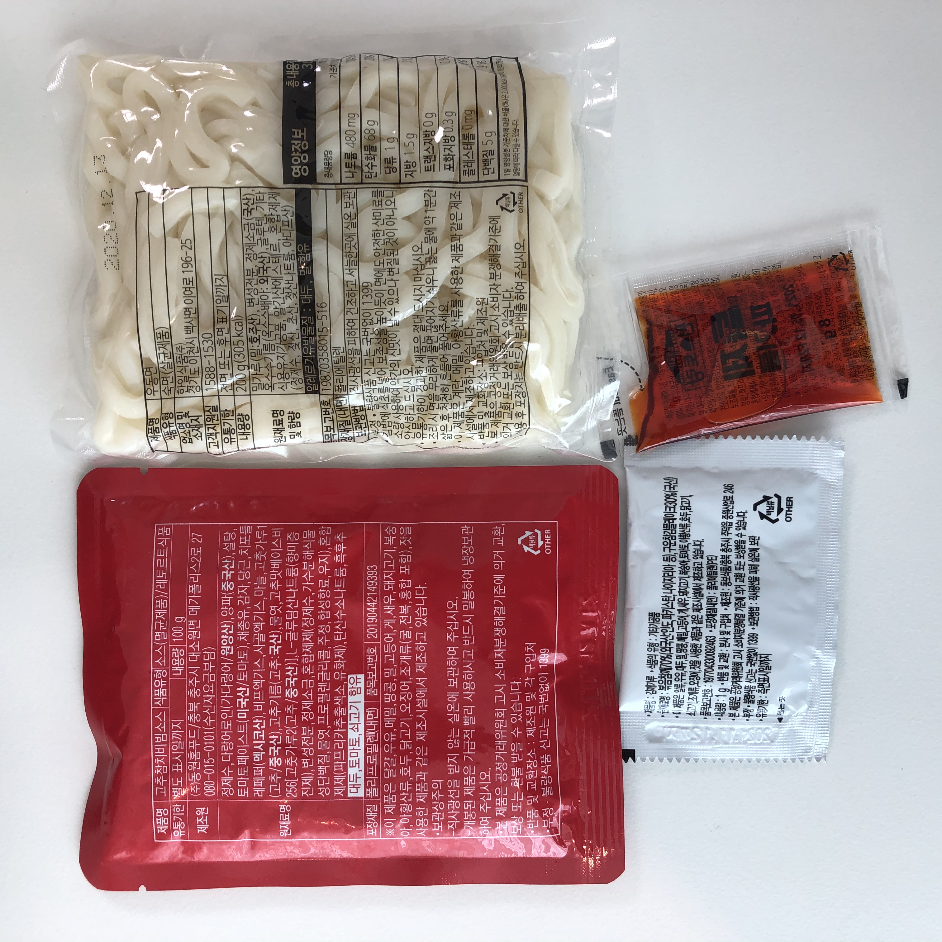 상단에 고추참치 비빔소스 와 우동면을 용기에 넣으시면 되고, 김깨가루와 특제 파기름은 후첨입니다.