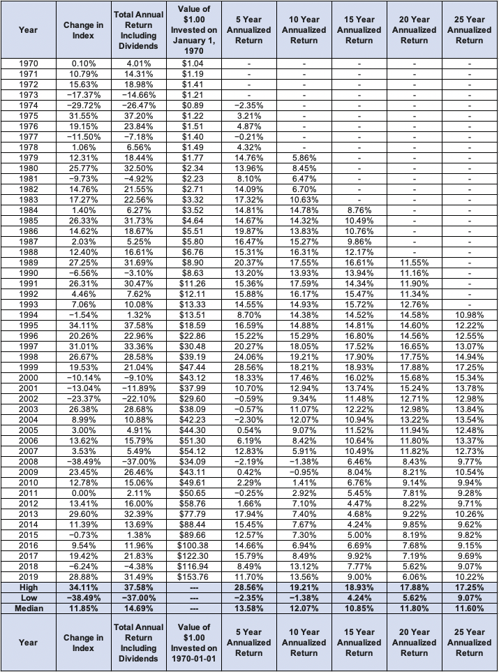 "Value of $1.00 Invested on january 1, 1970" 컬럼 : 1달러를 1970년 부터 투자했을 때의 금액변화를 나타내고 있습니다.