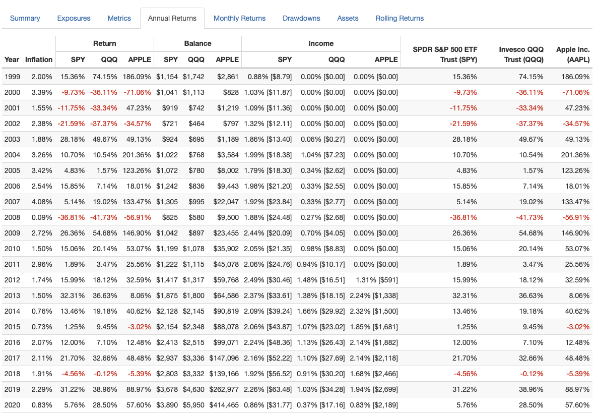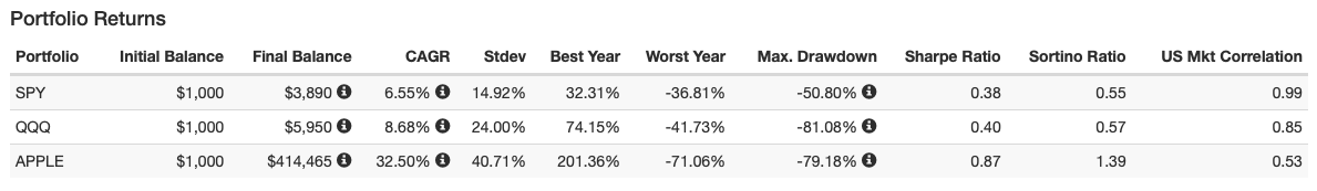 2000년에 제가 1,000달러를 투자했다면.... 20년후인 지금 SPY, QQQ, APPLE은 각각 3.9배, 6배, 400배의 성과를 거두었습니다.