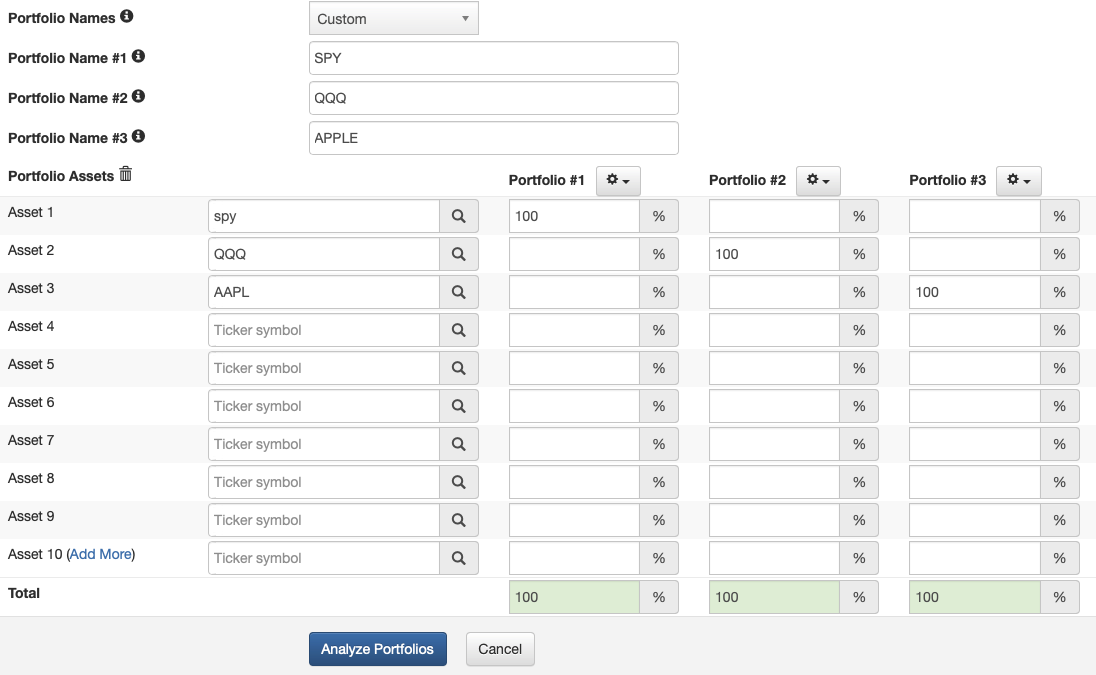 위 사항들을 참고하셔서 선택하신 후 아래 Portfolio name을 적고, Asset1~N에 본인의 포트폴리오를 구성하시면 됩니다.