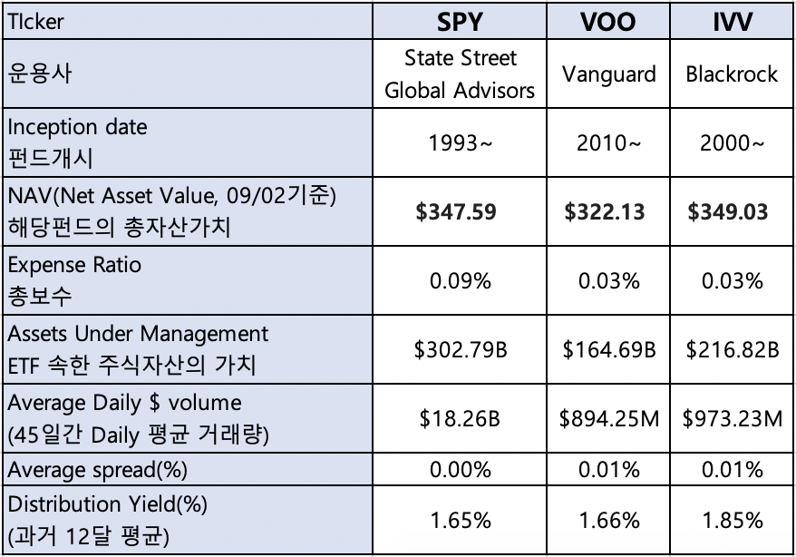아무래도 먼저 나온 SPY의 점유율을 뺐기 위해 저렴한 보수를 내세워 운용하고 있는 것이 아닐까 싶습니다.