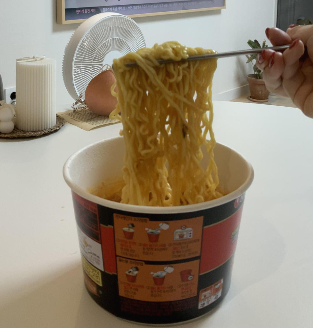 면굵기는 신라면 기본 컵라면과 유사하거나 조금더 얇게 느껴집니다.