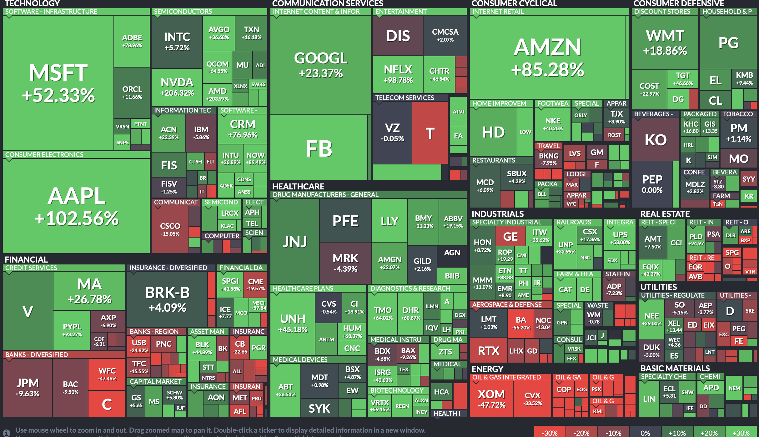 1년간 S&P500 종목들의 상승률을 시각화 해보면 대부분의 기술주들이 엄청난 비율을 차지하고 있습니다. (마소, 애플, 구글, 아마존 등..)