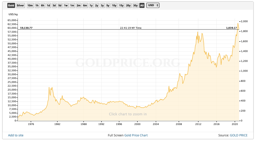 금의 가격은 최근 20년만 보더라도 500% 이상 증가했습니다. 아래와 같이 1970년도 부터 보자면 20배이상 오른 모습을 보실수 있습니다. 정말 어마어마한 가치상승입니다. 갈수록 활용되는 분야도 늘어나고 금의 채굴효율성은 사람들의 소비수준의 상승보다 덜 상승하니 금에 대한 욕구는 더욱더 늘어나는 것이 아닐까요? 거기다 화폐가치는 떨어지고 있으니 당연한 상승이 아닐까 싶습니다.