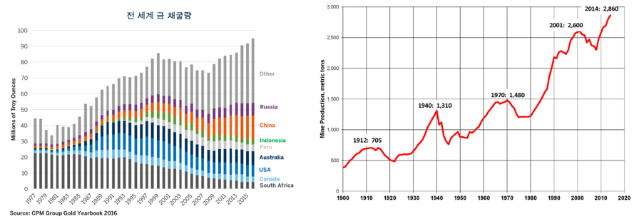 금생산량은 계속 증가하고 있습니다. 국가별로 다양한 공급처가 있으며, 35년간(1980년이후) 생산량은 180%가 증가했다고 합니다. 자연에 존재하는 금의 양은 한정되어 있을텐데 생산량을 계속 증가하고 있습니다.또한 금의 사용 용도 또한 다양해지고 있는 것이 현실입니다.