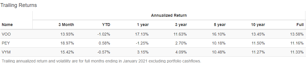 S&P500 ETF VOO의 수익률은 110%정도이고 PEY와 VYM의 수익률은 60~70%정도로 나쁜편은 아니지만 시장평균대비 저조한 모습입니다. (배당재투자 안할 때)