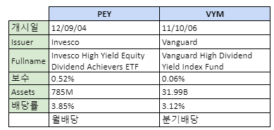 PEY와 VYM은 높은 배당률을 중요시하는 ETF라 보시면 됩니다. 더불어 각각 중요하게 생각하는 기준이 조금 다릅니다.
