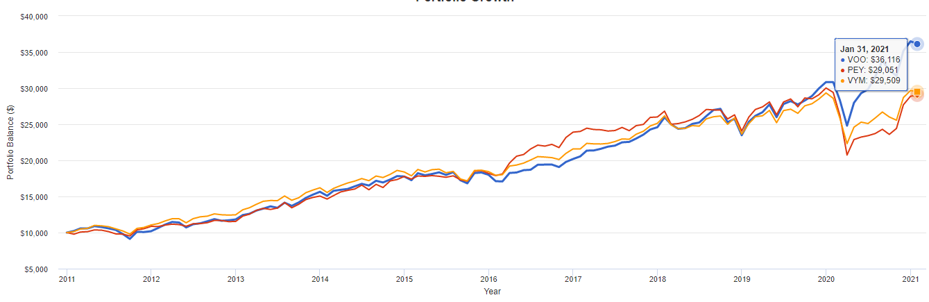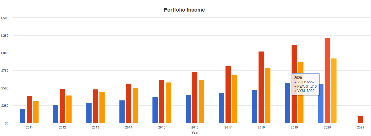 10,000달러 투자시 2020년엔 PEY, VYM이 VOO에 비해 거의 2배의 배당금을 받게 됩니다.