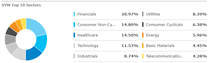 섹터구성은 PEY와 같이 금융섹터이 많은 비중을 차지하고 있습니다. VYM은 Tech섹터와 헬스케어 섹터의 비중이 유틸리티보다 상당히 높은 것을 확인할 수 있습니다.
