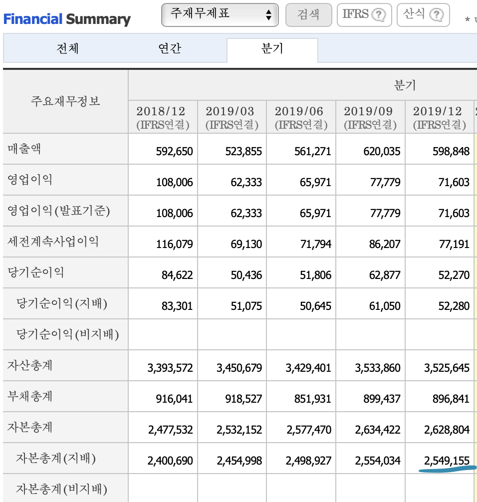 ※ 자본총계(=순자산, 자기자본, 장부가, 주주지분) : 간단하게 회사의 전체 자산에서 부채를 뺀 금액이며, 회사가 청산하고 주주들에게 나눠질 수 있는 금액이기도 합니다.